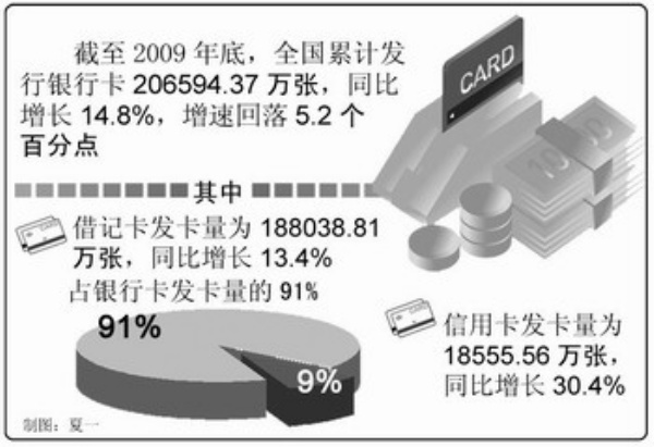 截至2009年底,全国银行卡发行数量同比增长14.8%。其中,信用卡发卡量同比增长30.4%,我国借记卡发卡量与信用卡发卡量之间的比例约为10.13:1。