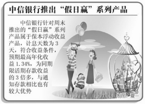 本报讯 中信银行近期推出“中信理财之假日赢”系列理财产品,投资者可以利用其在非证券交易日的闲置资金进行理财投资,全面满足客户短期闲置资金的理财增值和流动性的双重需求。据介绍,该产品除了通过柜台购买外,还可以通过网银操作即可完成购买。具有投资期限短,流动性强,资金到账及时三大特点,申购无需交纳手续费。 (郭瑞伟)