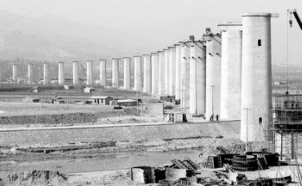 3月19日,工人们在天平铁路清水段牛头河特大桥工地施工。牛头河特大桥为天平铁路第二长特大桥,全长1.46公里,横跨清水县城。 周文涛摄(新华社发)