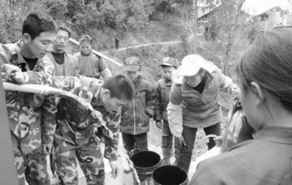在宅吉乡,乡政府全体干部职工被分成5个工作组,深入到村组各供水点组织供水。