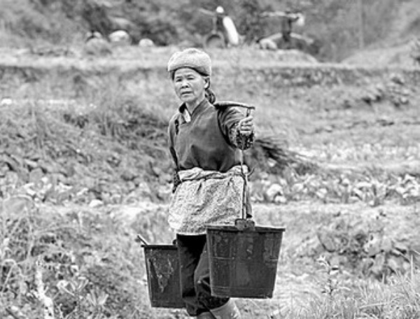 广西东兰县东兰镇伦界村,一名妇女在挑水抗旱抢春耕。 周 华摄