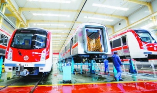 大连机车车辆有限公司城轨车间内等待交付的地铁车辆。 2009年,中国北车所属的大连机车车辆有限公司主营业务收入突破70亿元,较上一年增长70%以上;企业生产能力大幅提升,产品结构更加合理。 新华社记者 任 勇摄