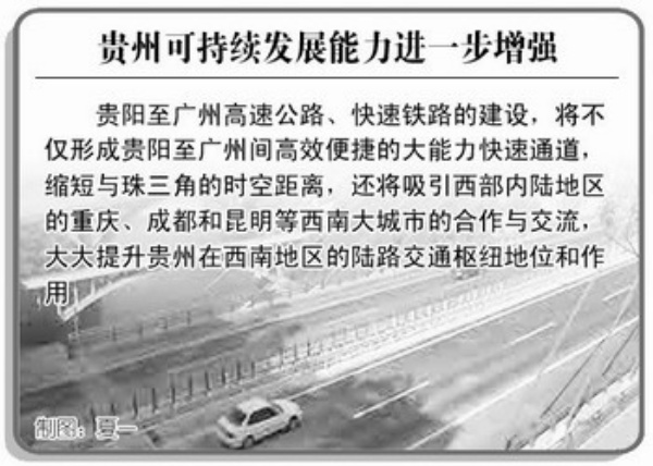 促进现代休闲旅游服务业发展。“两高”通车后,连接广州3小时左右的快速铁路和约8小时的高速公路将大大提高珠三角及港澳地区游客到贵州旅游的可进入性,休闲旅游业将是“两高”建设最先带动的产业之一。