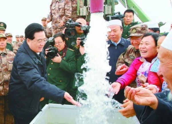 3月21日至23日,中共中央总书记、国家主席、中央军委主席胡锦涛在宁夏回族自治区考察工作。这是胡锦涛在银川市永宁县胜利乡园林村兰州军区给水工程团打井施工点,同当地群众一道高兴地用手捧起部队刚刚打出的井水。                                   新华社记者 李学仁摄