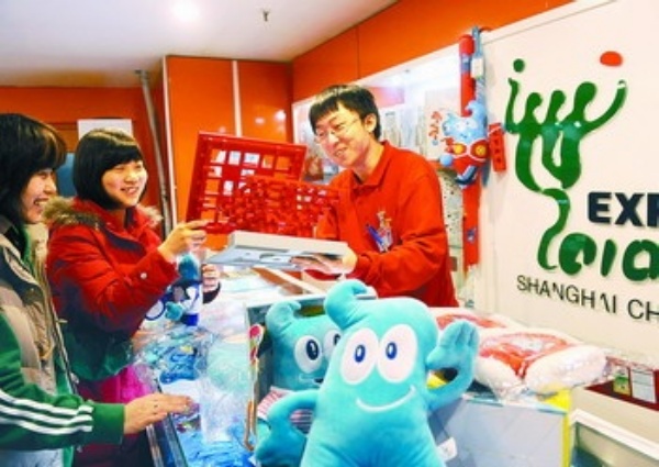 3月23日,北京王府井工美大厦世博会特许商品柜台前,顾客选购种类多样的世博特许商品。 上海世博会日益临近,人们关注世博的热情日渐高涨,纪念章、玩具、文化衫等世博会特许商品的销量增加。 本报记者 赵 晶摄