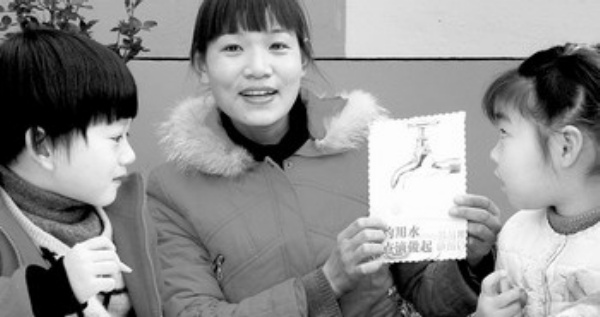 3月20日,苏州市彩香一村第二幼儿园的老师教孩子们认知“节水标识”。