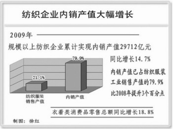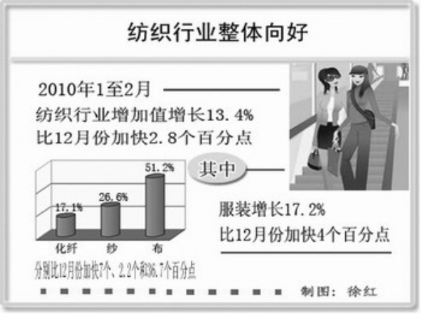 2009年,规模以上纺织企业完成增加值比上年增长9.1%;今年1至2月,纺织行业增加值同比增长13.4%。