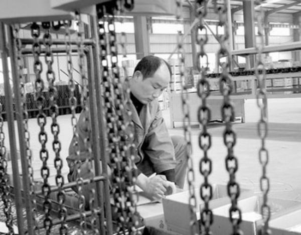 河南省南阳市卧龙区金鹏机电公司的员工正在生产。这家公司生产电动葫芦、手动葫芦、圆环链条、门式起重机、吊装索具等系列起重运输机械。他们自办机械研究所,自主研发20余种规格的80级高强度圆环链条,填补国内高强度圆环链条的空白。2009年企业依靠自主创新成功抵御国际金融危机的冲击,完成产值1.13亿元,实现利税365万元。