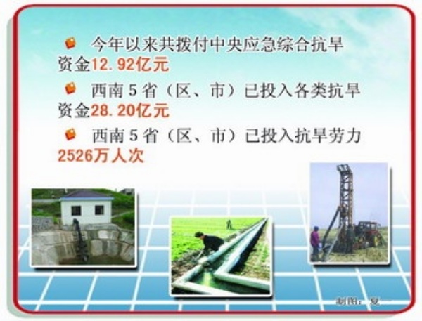 据介绍,为支持当前西南地区抗旱减灾,中央和地方加大资金投入,今年以来共拨付中央应急综合抗旱资金12.92亿元,其中特大抗旱补助经费1.55亿元;提前下拨西南5省(区、市)今年中央预算内投资计划经费63.63亿元,其中54.8亿元用于解决1360万农村人口的饮水安全问题。目前,西南5省(区、市)已投入各类抗旱资金28.20亿元。