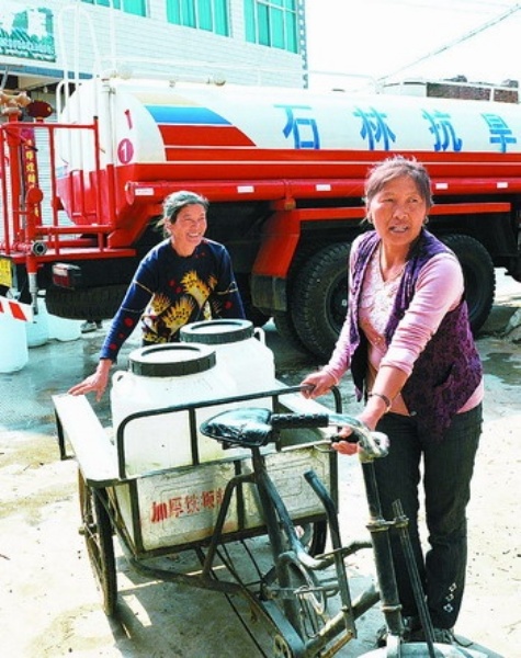 3月25日,石林县唐家村两位村民在搬运领到的水。目前,云南省昆明市石林彝族自治县有关部门积极组织车辆、人员到抗旱救灾一线帮助群众寻找新水源,为群众运送生活用水。 新华社记者 何俊昌摄