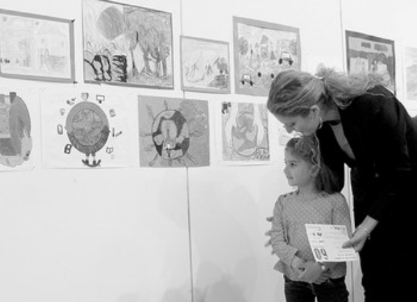 日前,在塞浦路斯首都尼科西亚,一名儿童在家长的陪同下观看画展。塞浦路斯环保组织当日在首都尼科西亚举办儿童画展,展示了儿童以绿色环保为主题的绘画。此次画展是3月27日“地球一小时”熄灯活动的预热,旨在唤起人们的环保意识,倡导共同创建更加绿色的未来。 新华社记者 王 强摄