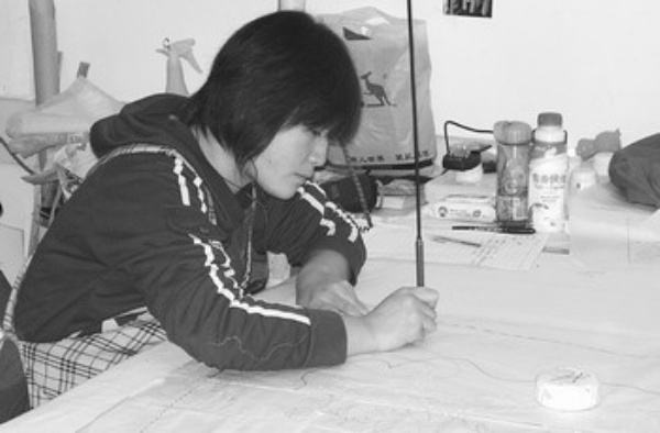 和孙颖不同,北京剧装厂的副厂长石金栓出身于剧装制作世家,他的父亲就是一位行里的老师傅。 “第一样学的是裁剪,当时我看师傅裁得挺利落,以为不难,其实这是个复杂的活儿。一开始师傅不让我动剪子,让我先看半个月,然后再从最简单的开始学。”石金栓说。剧装中工艺最简单的就是彩裤。做彩裤要把布料先裁剪成两片,再合起来。可石金栓第一次裁剪彩裤的时候,却照着自己穿的西裤把布料剪成了4片。“师傅一看就气坏了,说‘一眼没看见,你怎么就下了剪子了?’后来我明白了,要‘紧尺子,慢剪子’,下剪子只能一次成功。要是剪坏了,就没办法补救了。不管是几万元还是十几万元的剧装,都靠这一剪子。”光是裁剪,石金栓就学了3年。那时候老师傅传授手艺都是口传心授,石金栓用心地把师傅的话记在一个笔记本上,一直到现在,这个笔记本还是新学员入门的捷径。“这一行,得干一辈子,学一辈子。”王金栓说,“以前传统剧用的剧装大多有固定的模式,现在的新编历史剧就不一样,像《同仁堂》、《宰相刘罗锅》,对剧装有很多新的要求,尤其要求剧装必须有时代感。我们的手艺也得跟上新戏的要求,从图案设计、面料选择,到裁剪制作都要重新创作。”