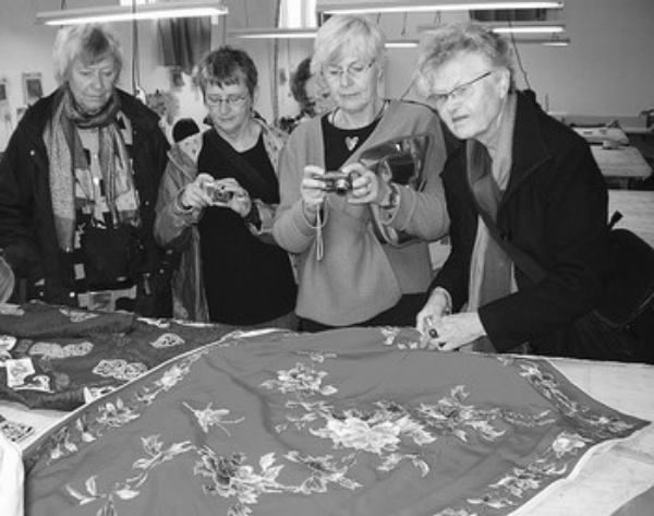 其他游客则饶有兴致地在车间里观看制作剧装的整个过程。不同种类的剧装有不同的制作工艺。戏衣制作包括设计、扎样、刷粉、刺绣、绷片、裁剪等工艺,盔头制作要经过打袼褙、喷花纹、拼活、掐丝、贴金、点绸等工序,靴鞋制作工艺大致包括选料、打袼褙、剪裁、绣花等。车间里展示的每一种工艺都引来了外国游客的连声赞叹,就连废布筐里的边角余料也让他们爱不释手。