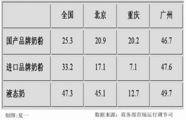 2010年2月份,全国千家重点零售企业液态奶销量同比增加47.3%,进口品牌奶粉销量同比增加33.2%,国产奶粉销量同比增加25.3%。另据对北京市近10家大中超市调研,春节后奶粉销售量比节前增长近一成,其中,进口奶粉销售火爆,国产奶粉销量明显恢复。据北京的石景山家乐福、北太平庄美廉美、方庄物美等超市反映,3月中旬,惠氏、美赞臣等进口品牌销售量比年初增长10%—20%,国产伊利、完达山、飞鹤等品牌也增长5%—10%。