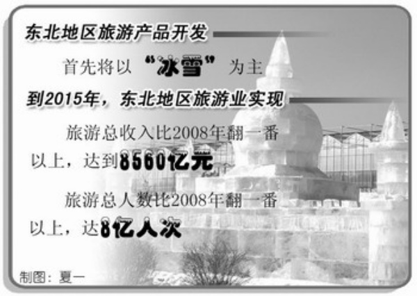 “到2015年,东北地区旅游业要实现旅游经济持续快速发展。实现旅游总收入、旅游总人数比2008年翻一番以上,达到8560亿元和8亿人次。”《规划》编制组组长、北京师范大学教授宋金平说,为实现这一目标,东北地区旅游产品开发首先将以“冰雪”为主,形成具有国际竞争力的冰雪旅游产品。