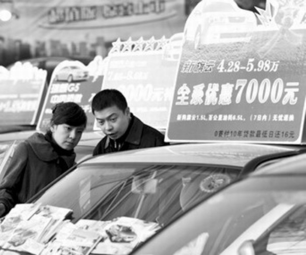 | 3月24日,两位市民在观看一款经济型轿车。在3月23日开幕的2010年哈尔滨百姓购车周上,低价位、低油耗的经济型轿车受到与会市民的关注与青睐。