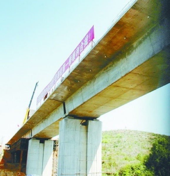 近日,由中铁五局湘桂铁路扩改工程第一项目部承建的湖南省永州市七新村双线大桥竣工。图为大桥雄姿。 谢永彬摄