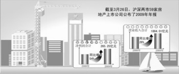 统计数据显示,截至3月26日,沪深两市59家已公布2009年年报的房地产上市公司当年合计实现营业收入1864.01亿元,同比增长26%;净利润合计265.25亿元,同比增长54%。总体来看,2009年,房地产上市公司营业收入、利润、现金流普遍大幅增长。