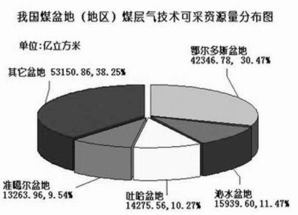 宋岩:根据国家973计划煤层气项目的研究成果,全国58个煤层气盆地(地区)进行计算、汇总,远景资源量32.86万亿立方米,技术可采资源量为13.90万亿立方米。煤层气技术可采资源量大于1万亿立方米的盆地有4个,分别为鄂尔多斯盆地、沁水盆地、吐哈盆地和准噶尔盆地,这4个盆地占全国煤层气技术可采资源量的62%,说明我国煤层气技术可采资源在地域分布上是比较集中的,有利于对煤层气资源进行规模性开发利用。截至2004年,各类煤层气钻井数不到300口,煤层气年产量约为0.2亿立方米;截至2008年底,各类煤层气钻井数达到3400余口,煤层气年产量增长到近5亿立方米。从统计数据看,我国煤层气产业进入到一个快速发展的时期。