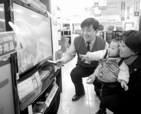 4月1日,在北京一家家电卖场顾客正在选购“世博家电”产品。当天,以“低碳节能”为特色的世博会家电特许产品开始在北京一些家电卖场销售。首批“世博家电”产品共涉及37个品牌409款产品,这些产品都统一贴有世博特许产品防伪标识,并经过严格质量检测和认证。 本报记者 赵 晶摄