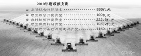 2009年中央财政完善农资综合补贴动态调整机制,水稻、小麦、玉米、棉花良种补贴实现全国全覆盖,大豆良种补贴在东北地区全面实施,启动马铃薯原种补贴试点,农机具购置补贴覆盖到全部农牧业县,上述补贴共1123.5亿元。测土配方施肥补贴范围扩大到所有农业县。推动现代农业发展,支出65亿元。农业综合开发投入165亿元,支持改造中低产田、建设高标准农田2660万亩,增加粮食综合生产能力327.3万吨。农业保险保费补贴59.7亿元,累计参保农户达到1.27亿户次。对农村低收入人口全面实施扶贫政策,并提高扶贫标准,补助资金197.3亿元,覆盖扶贫对象4007万人。加强农村、农业基础设施建设支出1168.7亿元,大力支持南水北调等重大水利工程建设,对3970座大中型和重点小型病险水库除险加固,实施农村饮水安全工程使6069万农民受益。中央财政森林生态效益补偿基金支持的国家级公益林扩大到10.49亿亩。