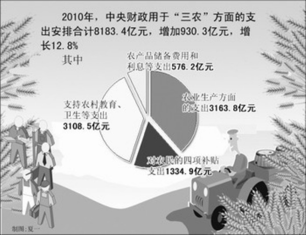 2009年,中央财政用于“三农”的支出合计7253.1亿元,增长21.8%。其中:支持农业生产支出2679.2亿元,对农民的四项补贴(粮食直补、农资综合补贴、良种补贴、农机具购置补贴)支出1274.5亿元,促进农村教育、卫生等社会事业发展支出2723.2亿元,农产品储备费用和利息等支出576.2亿元。
