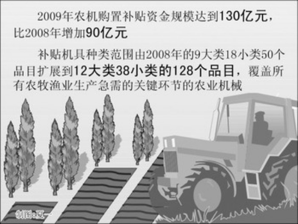 2009年,按照“保增长、扩内需、调结构”和实施积极财政政策的要求,中央财政大幅度增加了农机购置补贴资金,安排补贴资金130亿元,比2008年增加90亿元,增长225%。同时,将中央确定的农机补贴种类扩大到12大类38小类128个品目,将各地自行确定的补贴机具种类由5种扩大到10种,并将符合条件的生鲜乳收购站购买挤奶机械纳入补贴范围。在补贴标准上,全国总体上维持30%的补贴比例和单机补贴限额5万元的标准不变,同时向特殊地区和特殊环节倾斜,将四川汶川地震重灾区县补贴比例提高到50%,将100马力以上大型拖拉机、高性能青饲料收获机、大型免耕播种机、挤奶机械的补贴限额提高到12万元。