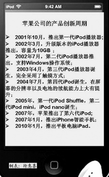 以iPod为例,苹果公司于2001年初开始研发iPod产品,2001年10月推出第一代iPod播放器;到了2004年7月第四代iPod诞生,在屏幕的分辨率以及电池的续航能力上大有提升;2005年,第一代iPod Shuffle,第二代iPod mini,iPod nano相继诞生;2007年,苹果推出了第六代iPod,产品更新速度之快匪夷所思。同时,在产品系列的创新上,苹果公司也加快速度,还在iPod热卖的时候,苹果公司已经在2006年开始研发iPhone产品;而今年推出的平板电脑,则是早在2003年即开始了研发。