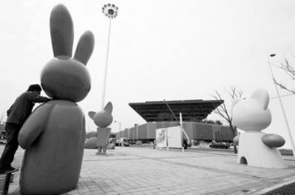 4月2日,一名工人在上海世博园区安装卡通动物造型雕塑。近日,上海世博园区各场馆建设和道路铺设进入尾声,各种造型的雕塑开始陆续在世博园区安装,迎接将于4月下旬举行的整体试运营。 新华社发