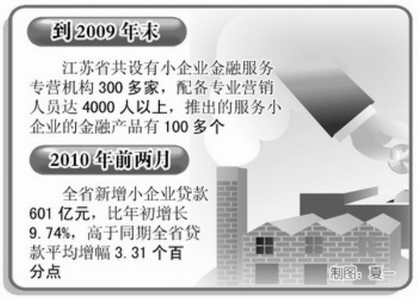 江苏银监局相关负责人表示,近年来江苏银监局创新服务方式,会同省中小企业局建设了银企交流对接的“中小企业融资服务网”,在推进银行业金融机构加强小企业金融服务专营机构建设、业务产品创新、完善信贷工作机制等方面取得了明显成效,有力地促进了全省小企业的稳定健康发展。到2009年末,全省共设有小企业金融服务专营机构300多家,配备专业营销人员达4000人以上,专营机构建设工作走在了全国的前列;推出的服务小企业的金融产品有100多个,其中属于省内银行自身创新的产品达30个,由于这些金融产品是为小企业量身定制的,满足了不同企业的多种需求;全省小企业贷款余额达6116亿元,全年增加1787亿元,增长41.3%,高于同期全省贷款平均增幅5.21个百分点;在今年贷款规模适当控制的情况下,前2个月全省新增小企业贷款601亿元,比年初增长9.74%,高于同期全省贷款平均增幅3.31个百分点。