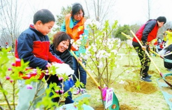 4月3日,北京玉渊潭公园,一对母子和志愿者参加植树活动。 本报记者 赵 晶摄