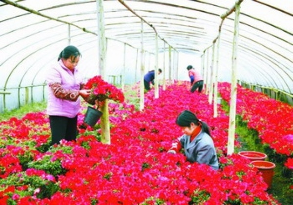 连日来,江西省兴国县高兴镇的花农正忙着在大棚里修剪杜鹃花。该县绿园花卉专业合作社喜获上海世博会20万盆杜鹃花订单,这些花将于4月底前全部运抵上海。 赖福鑫摄
