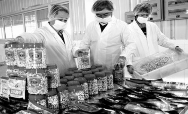 4月8日,山东省沾化县农业产业园食品加工车间的工人们正在包装食品。近年来,沾化县发挥区位优势,引进了多家农产品加工企业,建立了一批果仁产品加工基地和橄榄油、冬枣等农产品加工生产基地。 本报记者 李树贵摄
