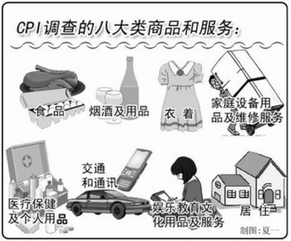 我国现行CPI调查的商品,根据13万多户城乡居民家庭消费的实际,按照消费数量较大、供应相对稳定、价格易于采集,价格变动趋势和变动程度有较强代表性,企业生产的必须是质量合格,产品包装上有注册商标、产地、规格等级等标识的原则,参照国际惯例结合我国实际确定划分为食品、烟酒及用品、衣着、家庭设备用品及维修服务、医疗保健及个人用品、交通和通讯、娱乐教育文化用品及服务、居住为八个大类,262个基本分类,600多个代表规格的商品和服务项目为经常性CPI调查目录。