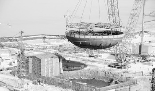 上图 2009年12月21日,浙江三门核电站一号机组壳底封头吊装到核岛上方。 陈 莹摄