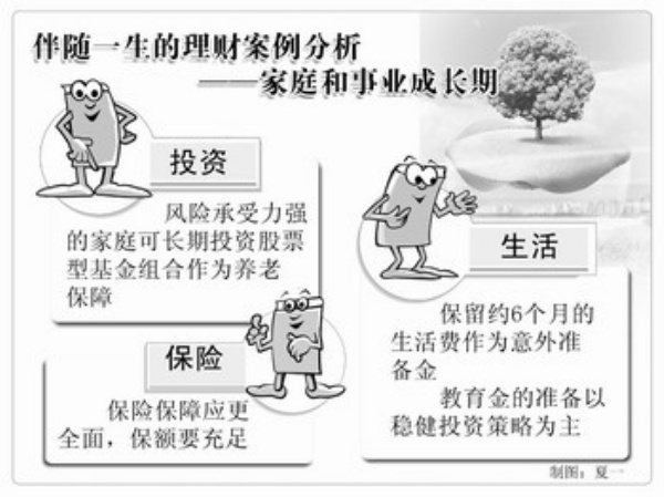 家庭与事业成长期是指家庭中从子女出生到子女完成大学教育的这段时期,一般为18—22年。在这个时期,家庭成员不再增加,整个家庭成员年龄都在增长,经济收入增加的同时花费也随之增加,生活已经基本稳定。但子女上大学后,由于高等教育支出的增加,家庭支出会有较大幅度的上升。对这一时期的家庭而言,应设法提高家庭资产中投资资产的比重,逐年积累净资产。