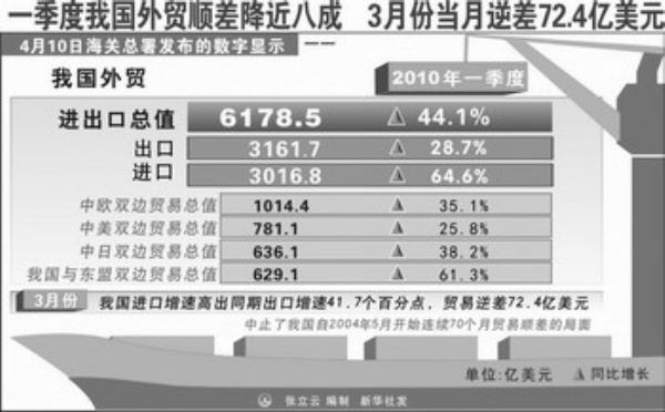 海关10日公布的数据显示,3月份我国外贸出现72.4亿美元的逆差,中止了自2004年5月开始连续70个月贸易顺差的局面。