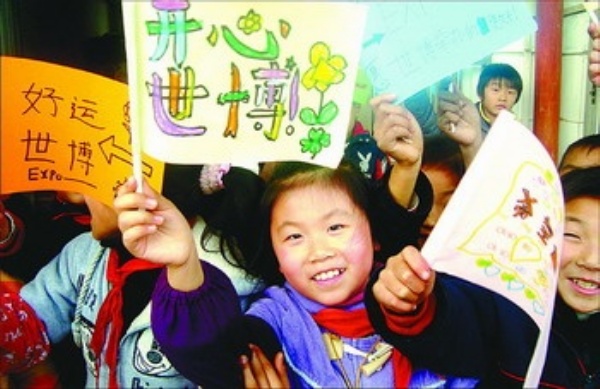 上图 宝山区中小学生表达对办好世博会的祝愿。