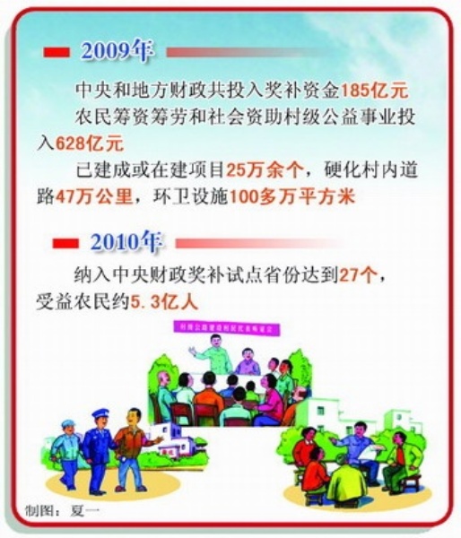 财政部副部长张少春表示,党中央、国务院高度重视村级公益事业建设一事一议财政奖补试点工作,经过各方面的共同努力,试点工作取得了显著成效,初步构建了“财政资金引导、农民筹资投劳、社会捐资赞助”的农村公益事业建设投入新机制。2009年,中央和地方财政共投入奖补资金185亿元,农民筹资筹劳和社会资助村级公益事业投入628亿元。相当于财政奖补1元钱带动了4元钱的村级公益事业建设投入,已建成或在建项目25万余个,硬化村内道路47万公里,环卫设施100多万平方米。