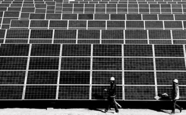 图3:3月15日,技术人员在为国投敦煌光伏发电公司的多晶硅太阳能板“洗脸”。 新华社记者 连振祥摄