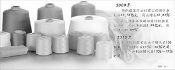 纺织服装业2009年全年运行整体前低后高,在内销好于预期的情况下,行业收入实现稳定增长。预计2010年纺织服装业出口增长在5%左右,内销增长在15%—20%之间,全行业收入和利润增长在10%—15%之间。