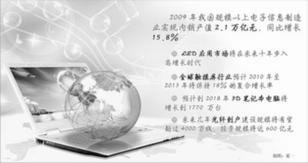 全球电子信息产业从2009年下半年开始情况持续好转,今年更呈现出较强复苏态势。由于我国出台了3G、家电下乡和以旧换新等一系列措施,有力地拉动了国内市场增长,2009年我国规模以上电子信息制造业实现内销产值2.1万亿元,同比增长15.8%。
