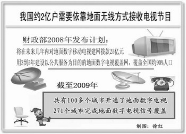 2008年,财政部发布计划,将在未来几年内对地面数字移动电视建网拨款25亿元资金。在这一资金扶持下,地面数字电视确立了规划目标:按照我国覆盖全社会的公共文化服务体系的要求,用3到5年时间,将建设以提供公共服务为目的的全国地面数字电视覆盖网,覆盖全国约90%的人口,除边远山区外的广大城乡居民,均能享受到地面数字电视服务。