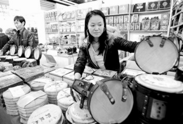 4月9日,一参展商家在展示茶叶精品。 当日,由中国国际茶文化研究会、中国茶禅博物馆等主办的“首届中国天津茶艺博览会”在天津国展中心开幕。贡牌龙井、八马茶业等数十个商家在博览会上展出了各自的茶叶精品。 新华社记者 刘海峰摄