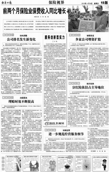 从今年前两个月的保费收入情况看,截至2010年2月底,我国保险业保费收入为2988.06亿元,同比增长40.74%,其中财产险保费收入为651.79亿元,人身险保费收入为2336.3亿元。这些数据表明,我国保险业仍处于快速增长期。市场上,结构调整依然是各家公司的主题。由于策略不同,保险市场的占比排位在发生着微妙的变化;随着新会计准则的实施,“保费规模”和“保险收入”将成为保险机构必须权衡的问题;监管层进一步规范了进入“保险集团”的经营范围,门槛的抬高意味着监管进一步严格。
