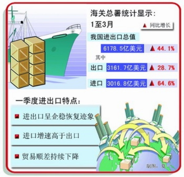 一季度,我国对外贸易延续去年底以来的恢复性增长态势。来自海关总署的统计显示,1至3月,进出口总值6178.5亿美元,同比增长44.1%。其中出口3161.7亿美元,增长28.7%;进口3016.8亿美元,增长64.6%;贸易顺差为144.9亿美元,同比下降76.7%。