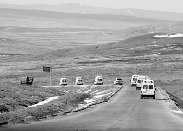 4月16日,来自甘肃的医疗救护车辆沿214国道向玉树灾区进发。目前,来自全国各地的大批救援物资正源源不断地向地震灾区输送。214国道西宁至玉树的800余公里公路成为向灾区输送物资的生命线。 新华社记者 沈伯韩摄