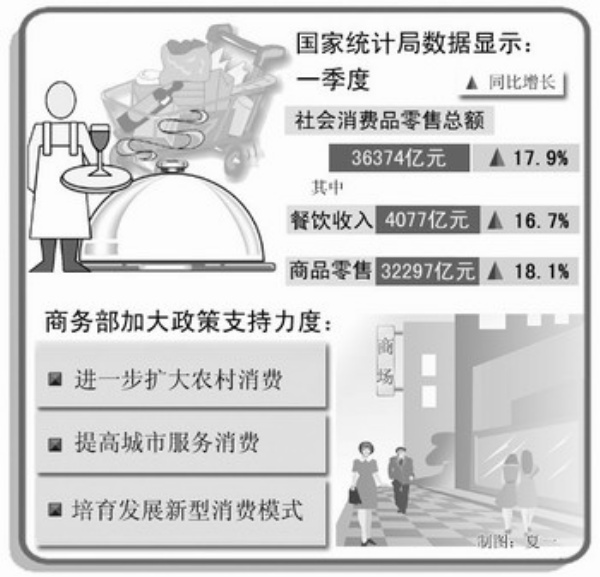 来自国家统计局的数据显示,一季度,社会消费品零售总额36374亿元,同比增长17.9%,比上年同期加快2.9个百分点。按经营单位所在地分,城镇消费品零售额累计30571亿元,增长15.4%。按消费形态分,餐饮收入4077亿元,增长16.7%;商品零售32297亿元,增长18.1%。
