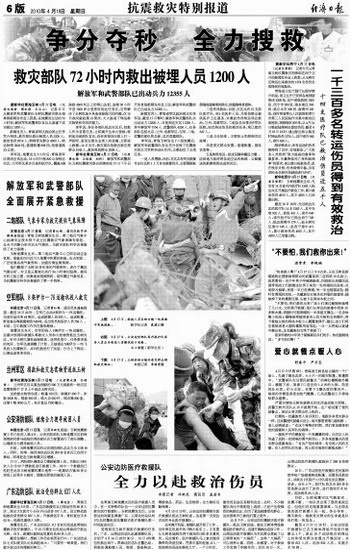 李军说,各任务部队抵达灾区后,把救人作为首要任务,立即展开生命大营救。特别是当地部队官兵,没有来得及向家人打一声招呼,甚至忍着失去亲人的悲痛,立即投入救援。14日当天,救灾部队抢救出被压埋群众1045人,救治受伤群众2038人。