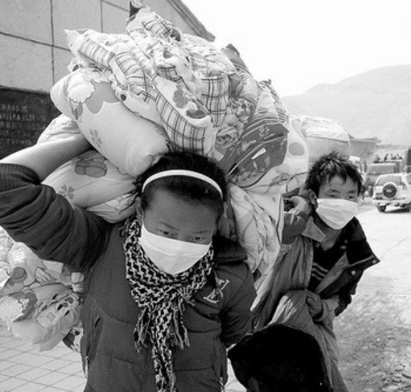 下图 4月17日,玉树县结古镇的受灾群众领取救灾物品。 本报记者 李树贵摄